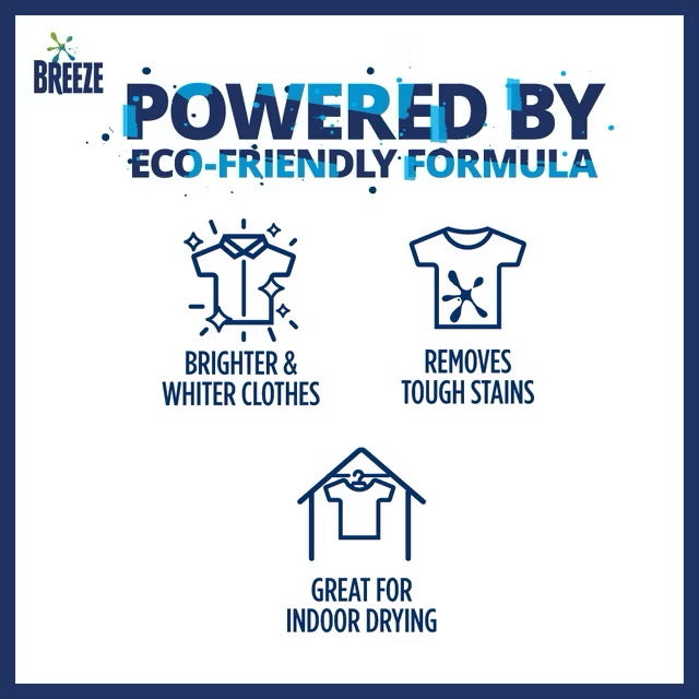 Breeze Power Clean with Radiant White Technology, specially formulated to remove tough stains with 3X power while keeping your clothes dazzling white.