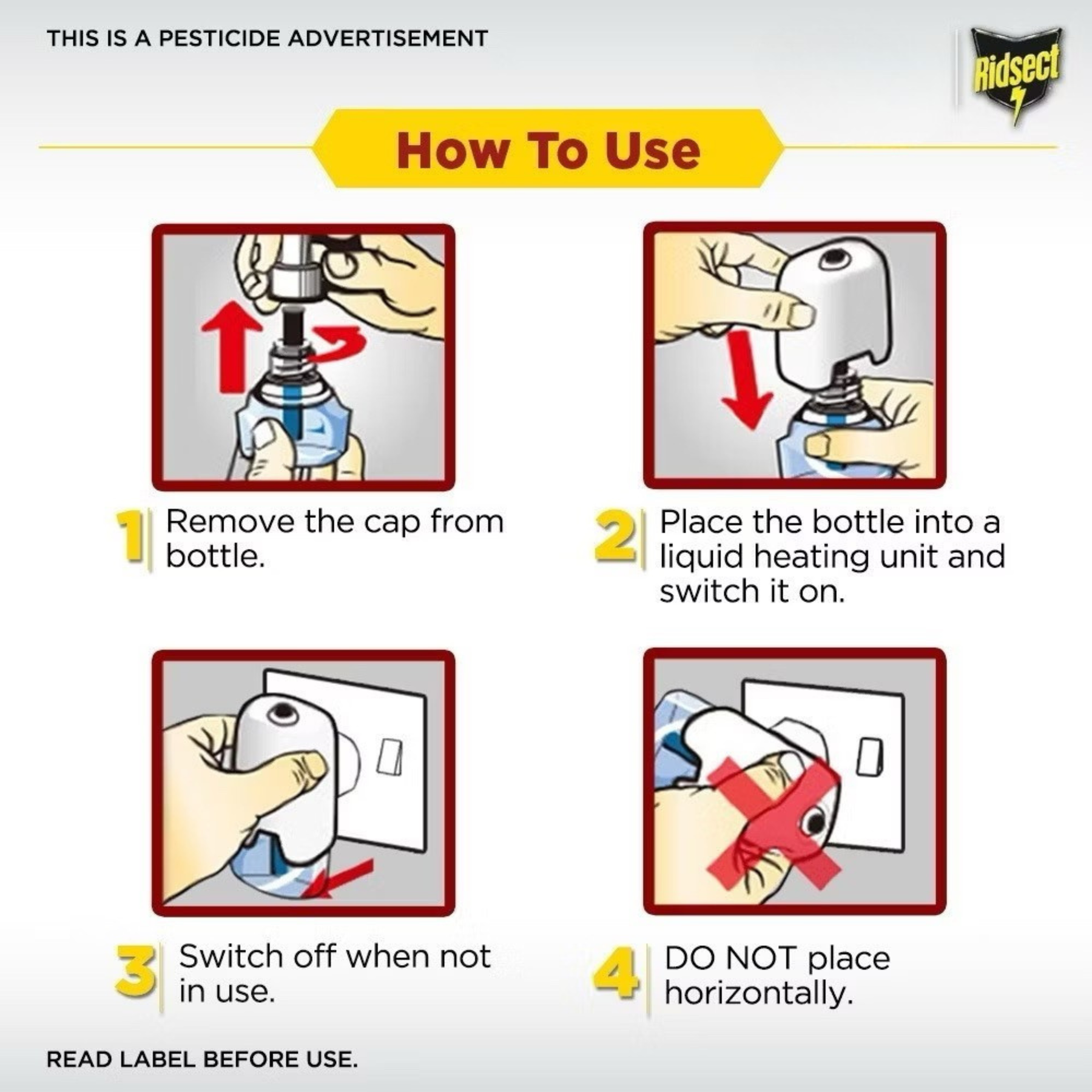 Ridsect Liquid is a liquid vaporiser refill to be used with liquid electric vaporiser. When switched on, it repels mosquitoes and protects you effectively all night long.