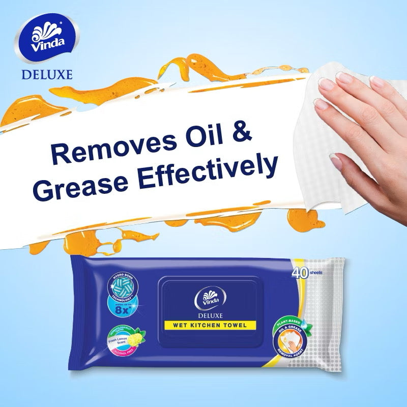 Wipe your kitchen woes away with this dermatologically tested and alcohol free wet kitchen towel. Removes oil and grease effectively for fast and easy cleaning.